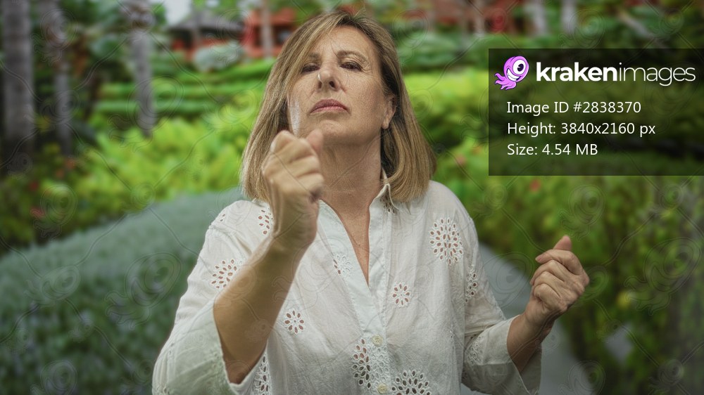 Woman in white blouse holding clenched hand gesture in forest setting among green shrubs and trees; determination.