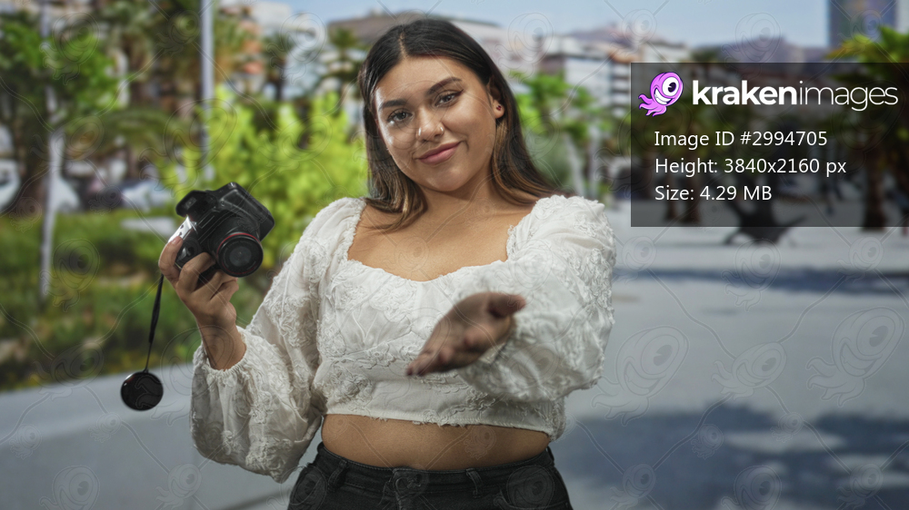 Woman in white blouse holding dslr camera with lens cap dangling extends palm toward viewer on street lined with palm trees and buildings; welcoming.