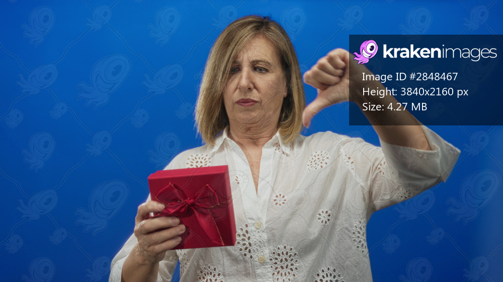 Woman in white blouse holding red giftbox with thumb down in blue photo studio; disappointment regret.