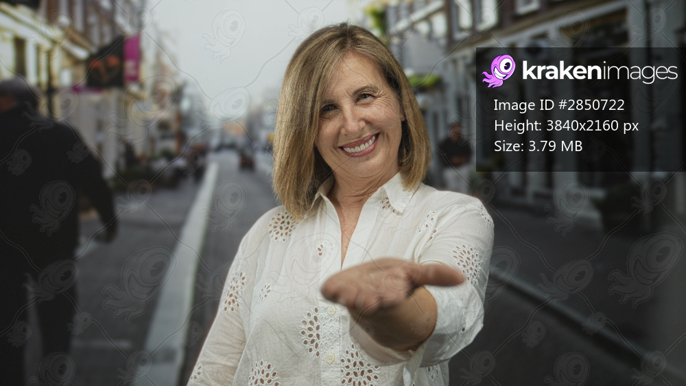 Woman in white blouse holds out open hand palm up on historic sunlit city street lined with shops; joy.