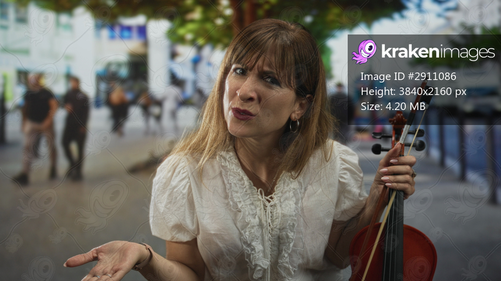 Woman in white blouse holds violin and shrugs palm while grimacing on a busy city street crowded with pedestrians; frustration busking struggle.