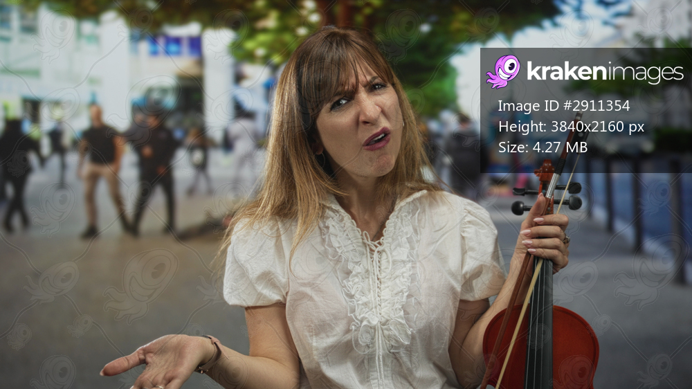 Woman in white blouse holds violin and shrugs palm while grimacing on a busy city street crowded with pedestrians; frustration busking struggle.