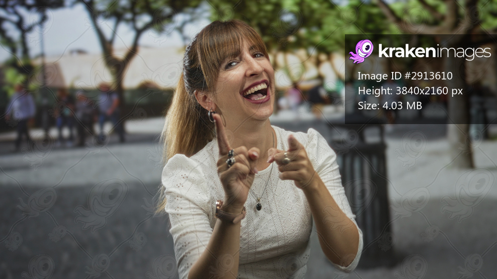 Woman in white blouse points finger to camera on street with trees and trashcan nearby; playful confidence.