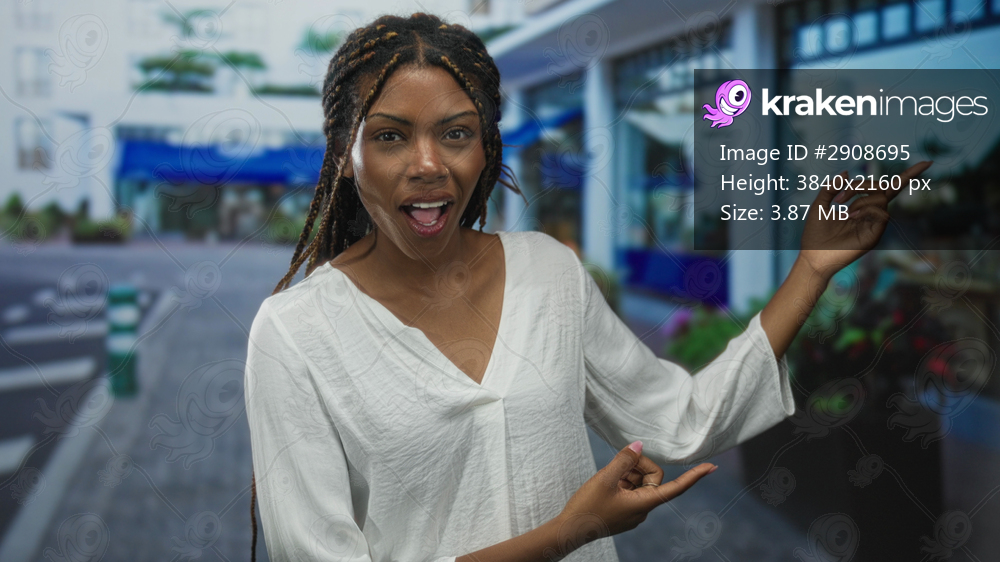 Woman in white blouse points finger toward storefront on street, smiling and gesturing with hand; playful curiosity.