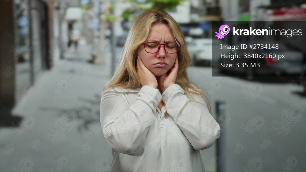 Woman in white blouse with red glasses appears thoughtful on a busy city street, hands touching her face with a calm expression amidst urban background. - Kraken Images