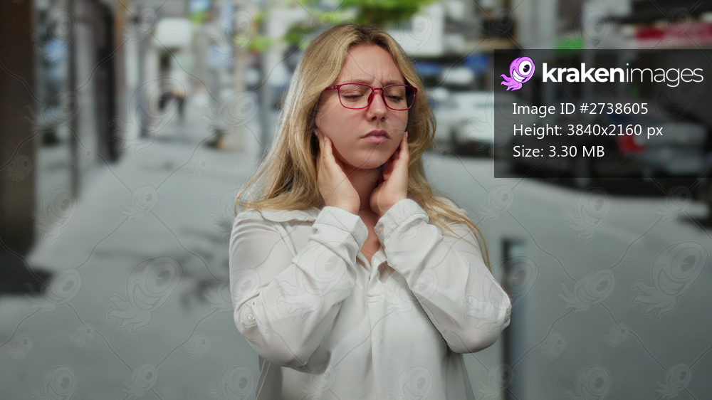 Woman in white blouse with red glasses appears thoughtful on a busy city street, hands touching her face with a calm expression amidst urban background. - Kraken Images
