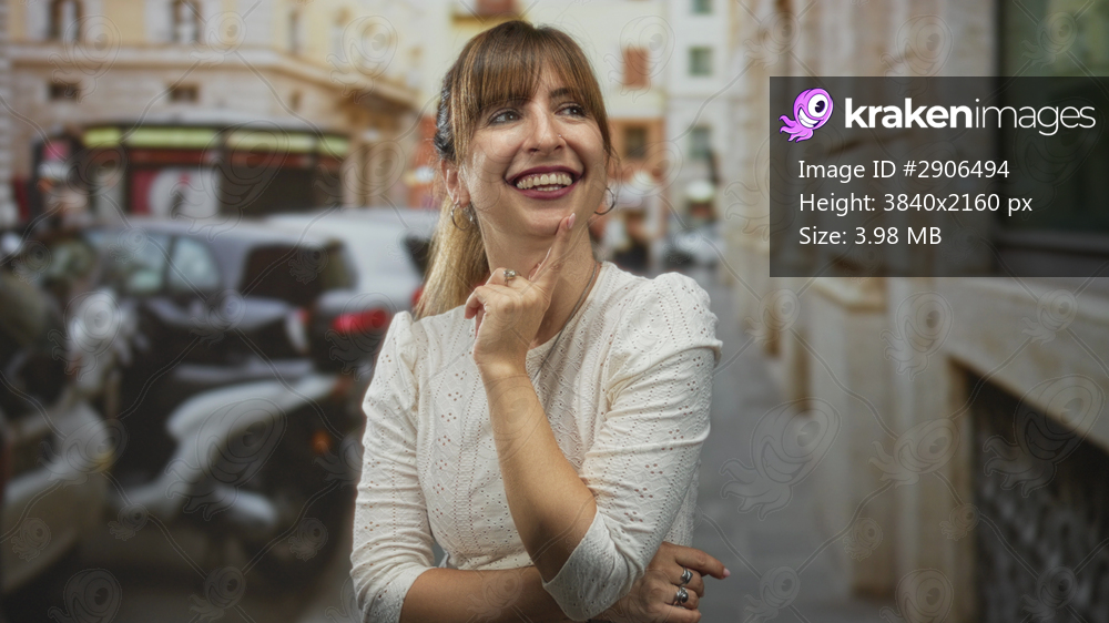 Woman in white blouse smiling with finger to cheek, rings visible and pendant necklace standing on narrow city street; playful curiosity delight.
