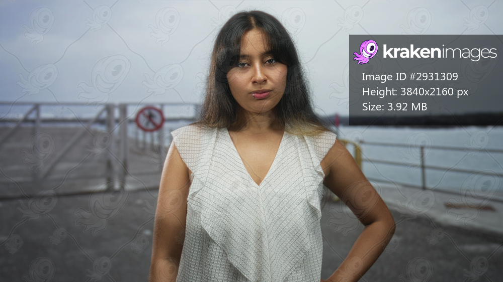 Woman in white blouse standing with hand on hip and eyes closed near a pier gate on a street jetty; calm reflection.