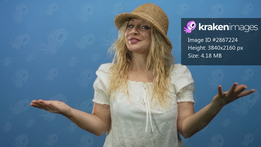 Woman in white blouse and straw hat holds arms open with palms up in a studio against a blue backdrop; joy openness.