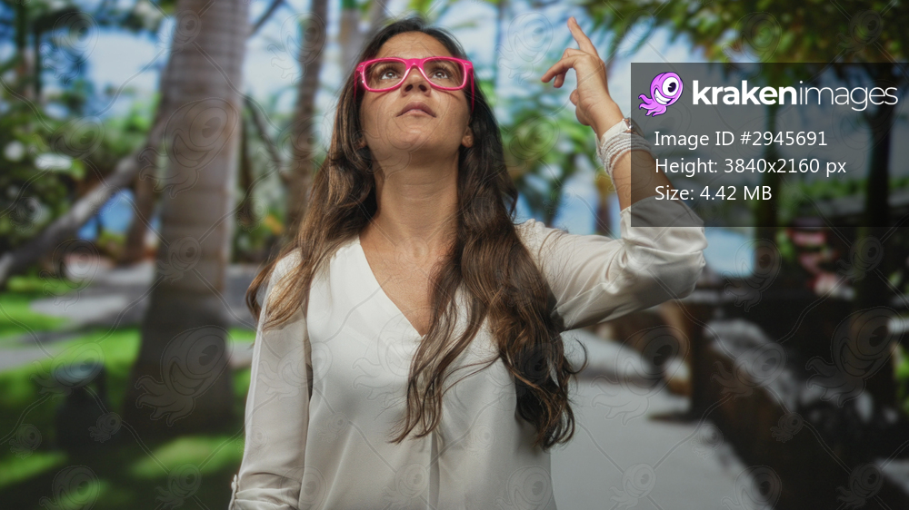Woman in white blouse wearing bright pink glasses pointing finger to temple on forest walkway; thoughtful reflection.