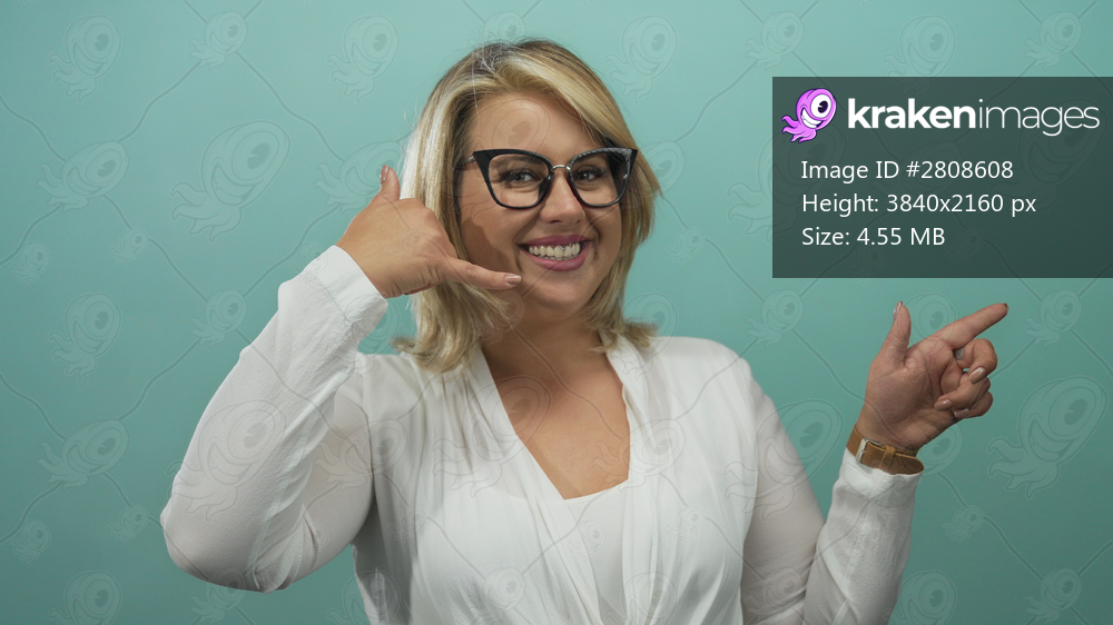 Woman in white blouse wearing glasses points finger in studio while making call gesture; welcoming.