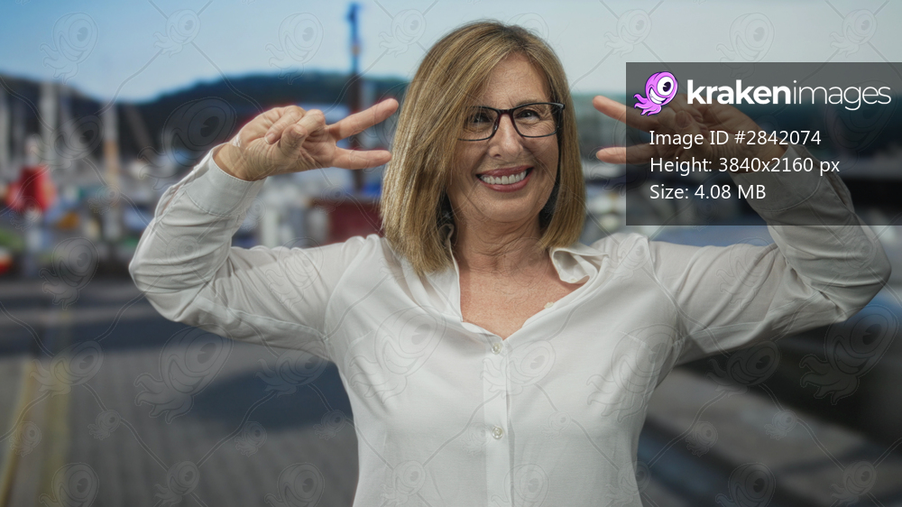 Woman in white blouse wearing glasses smiling and making peace sign with both hands at seaside port; joy.