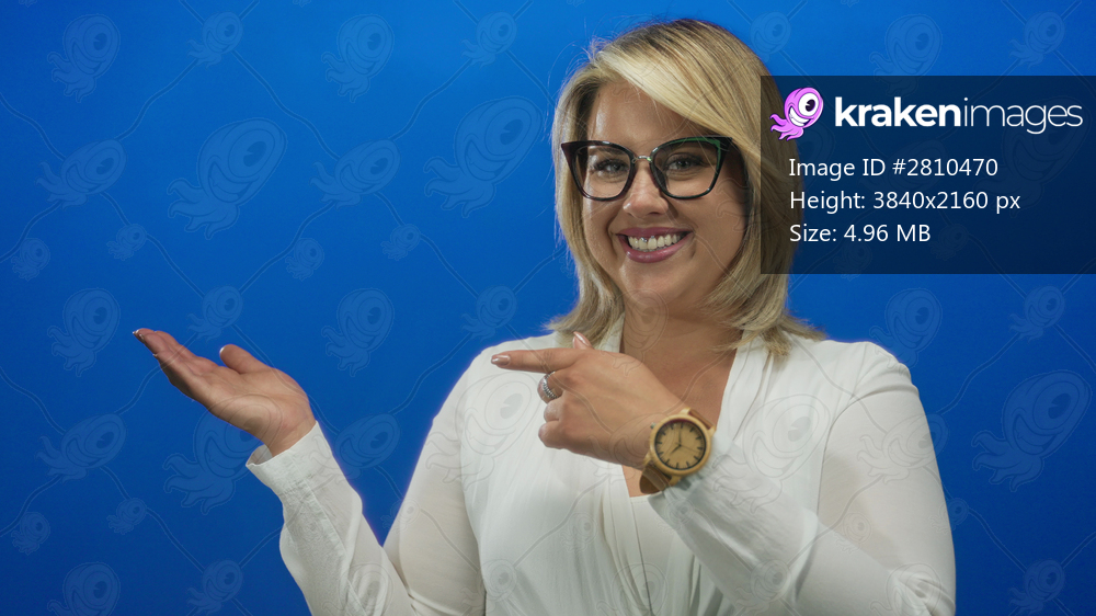 Woman in white blouse wearing glasses and wooden watch smiling points finger to open hand in blue studio; invitation.