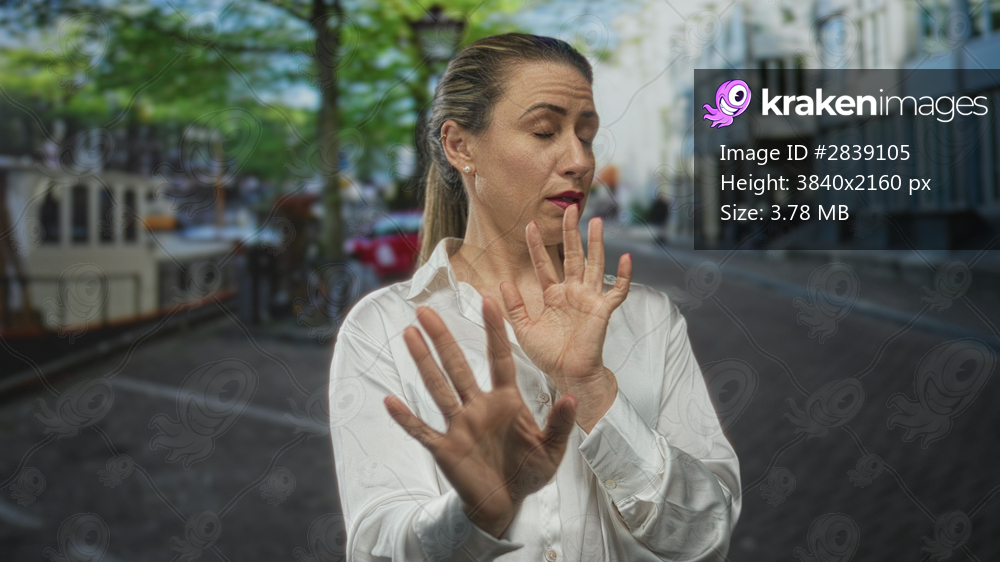 Woman in white buttonup shirt holds hands up with palms outward on street by building; disgust refusal.