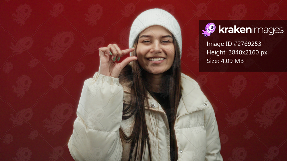 Woman in white coat and beanie gesturing on red background exudes warmth and style while expressing smallness with a cheerful smile.
