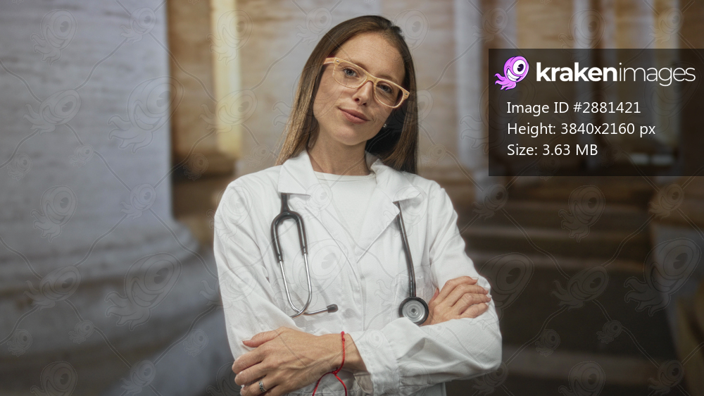 Woman in white coat and glasses with stethoscope, arms crossed showing hands and red bracelet on stone steps of building colonnade in old town; confidence. - Kraken Images