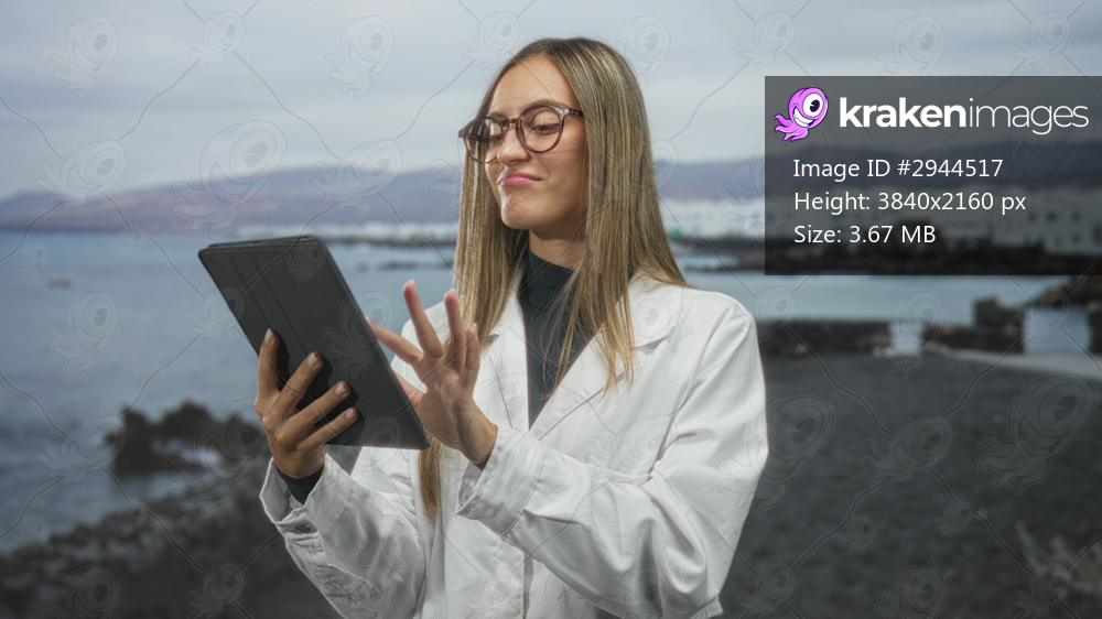 Woman in white coat and glasses swiping a tablet with index finger at rocky coast while frowning; skepticism focus.