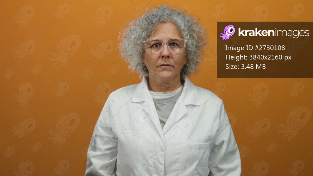 Woman in white coat with grey hair and glasses stands confidently against an orange wall background, exuding professionalism and expertise in science or healthcare. - Kraken Images
