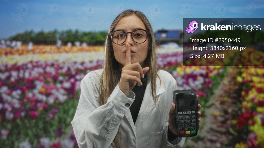 Woman in white coat holding a payment terminal and finger to lips for silence in studio floral backdrop; silence.