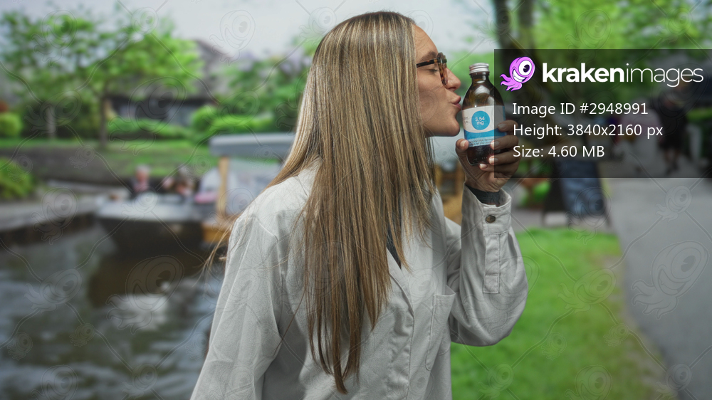 Woman in white coat holding a supplement bottle and smiling on a street by a canal near outdoor cafe; wellness cheerful.