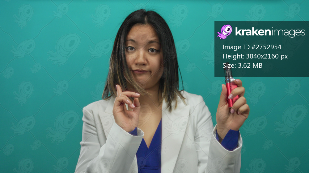 Woman in white coat holding e-cigarette against green background making no gesture suggesting disapproval of vaping emphasizing concerns about health and safety. - Kraken Images