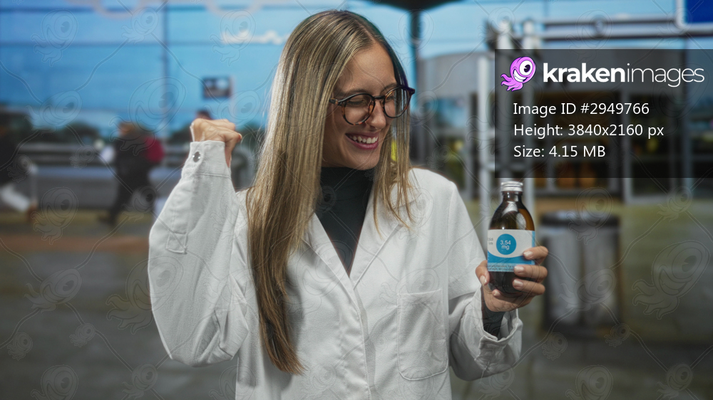 Woman in white coat holding medicine bottle and making fist pump at airport terminal entrance; joy success.