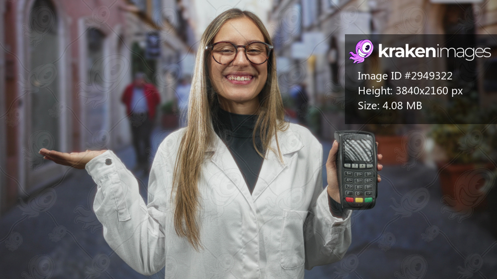 Woman in white coat holds card reader and gestures palms up on a narrow city street while presenting payment terminal; welcoming service.