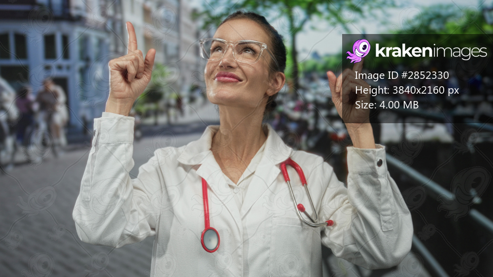 Woman in white coat with red stethoscope pointing finger upward on busy city street; optimism innovation progress.