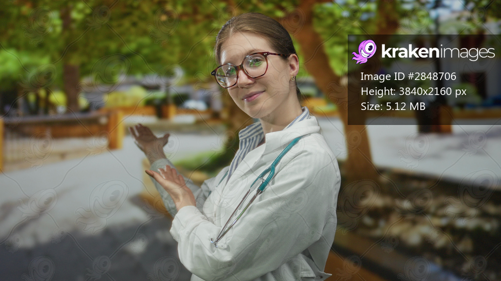Woman in white coat with stethoscope and blonde hair gesturing to surroundings in green park; compassion health.