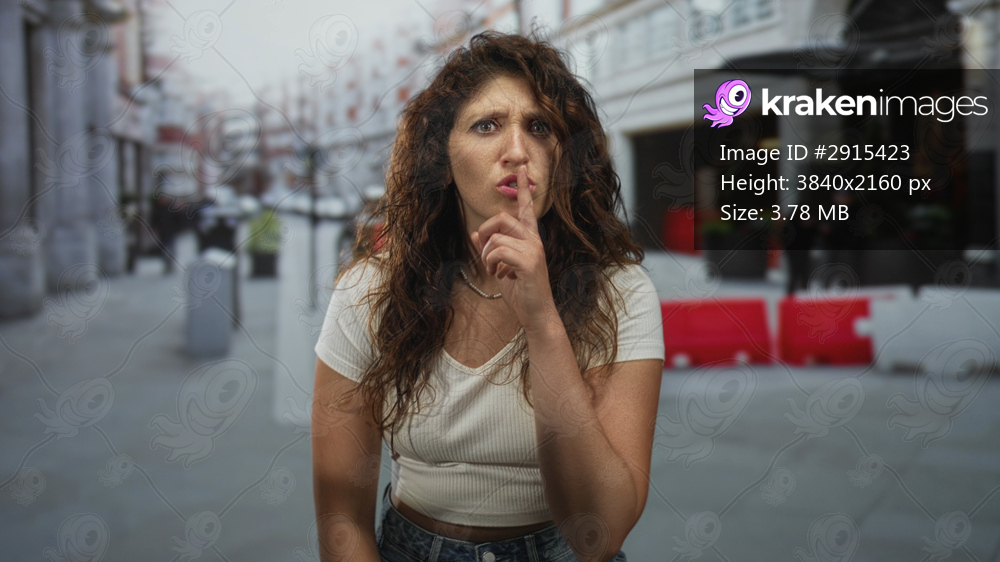 Woman in white crop top and jeans with finger to lips for silence on city street, direct stare and raised hand; secret warning serious.