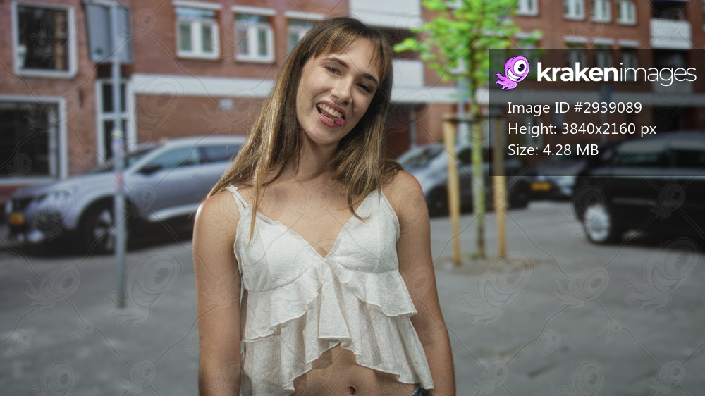 Woman in white crop top smiling and sticking tongue out on street with parked cars and brick building; playful confidence.