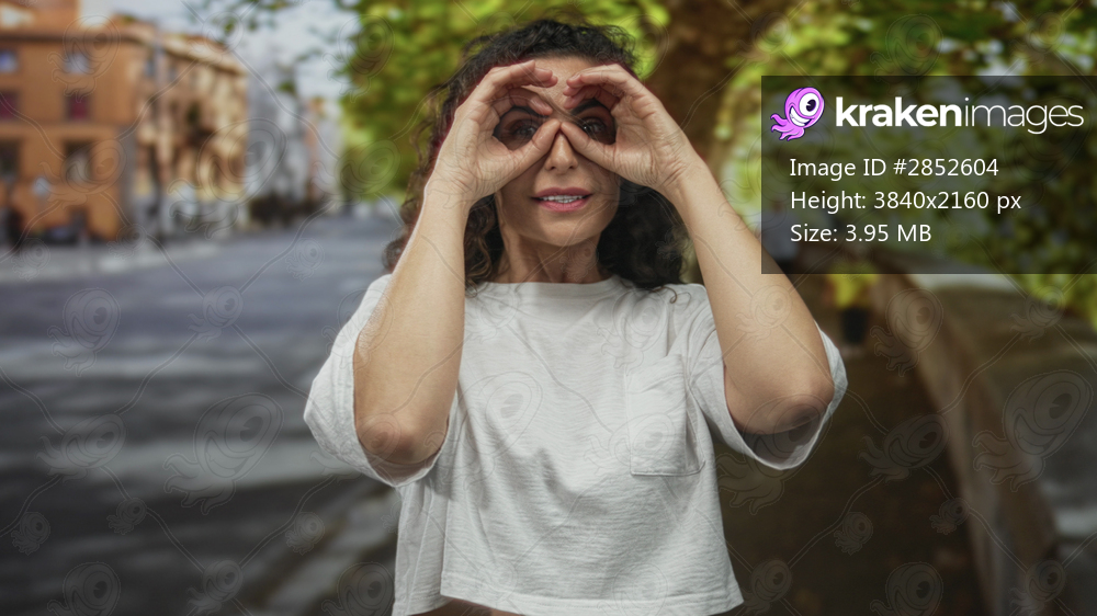 Woman in white cropped tee makes binocular gesture with hands over eyes on sunlit urban street; curiosity.