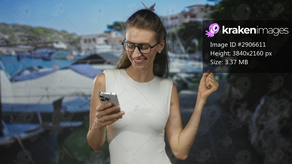 Woman in white dress and glasses smiling while holding smartphone on street by marina boats and dock; joy connection.