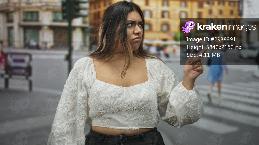 Woman in white embroidered blouse with hands raised and pointing finger while frowning at traffic in a busy city street; frustration.