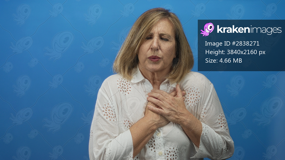 Woman in white eyelet blouse clutching chest with both hands while wearing a pained expression in blue studio setting; pain.