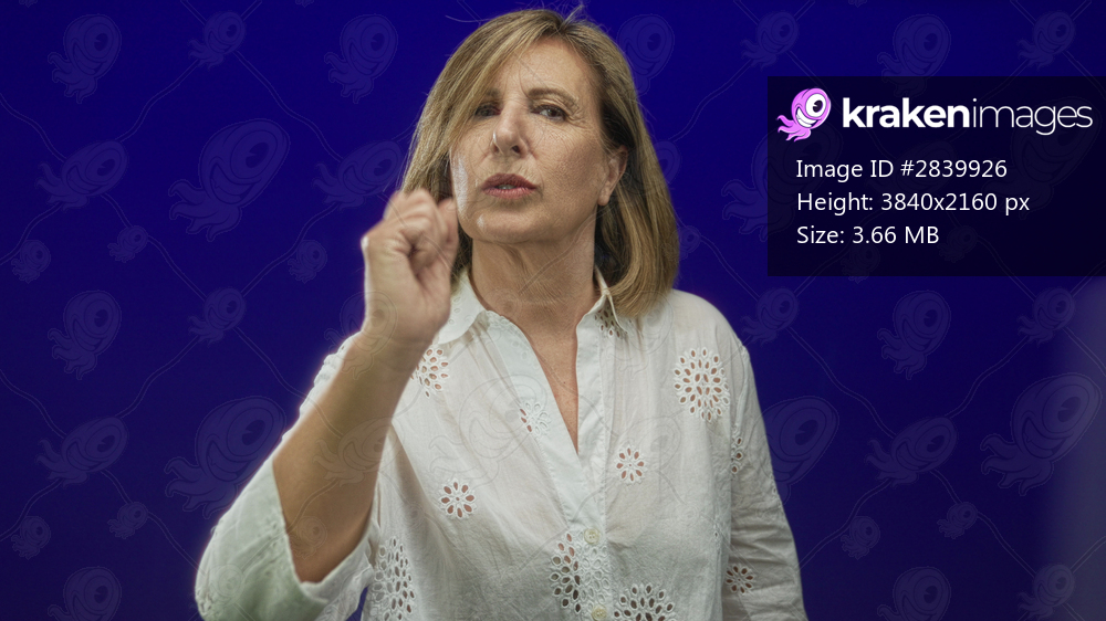 Woman in white eyelet blouse raises clenched fist and tilts head against purple studio setting; confusion.