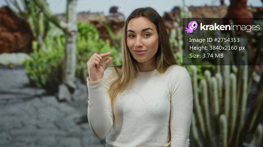 Woman in white gesturing small size outdoors with cacti in background showing playful expression in park setting.