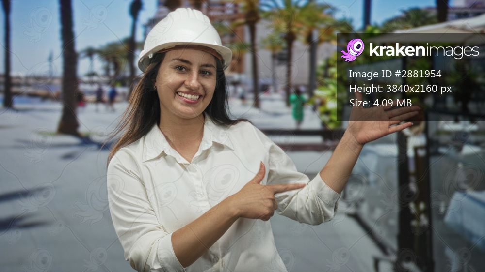Woman in white hardhat clapping hands on street outside restaurant terrace while reviewing plans; confidence design planning.