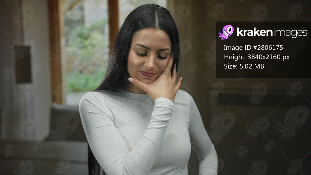 Woman in white indoors appearing thoughtful or contemplative with hand on forehead against a soft focus background implying an introspective moment in a relaxed indoor setting - Kraken Images