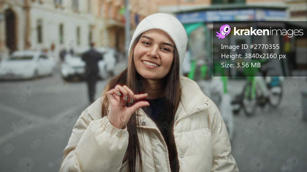 Woman in white jacket and beanie smiles joyfully on urban street while making small gesture with fingers near several parked bicycles and bustling city backdrop - Kraken Images
