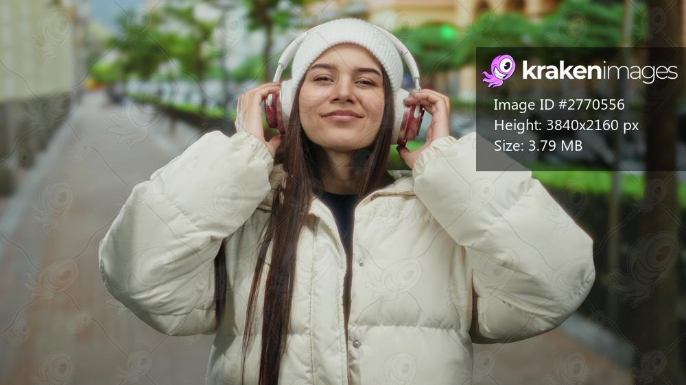 Woman in white jacket with headphones enjoying music on a city street with trees and smiling under a cloudy sky.