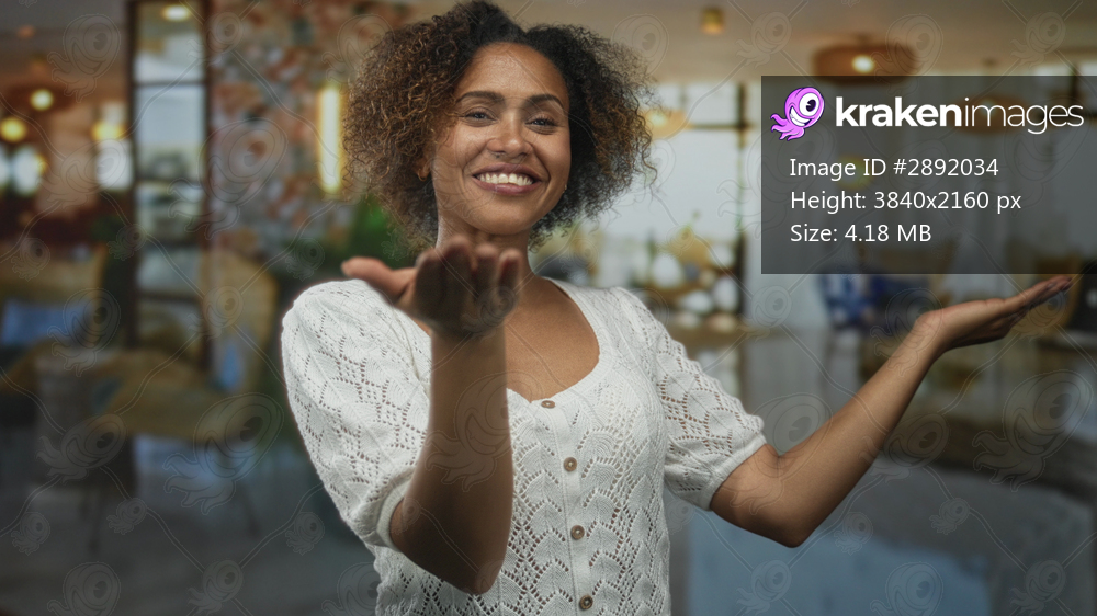 Woman in white knit top smiling, palms up presenting to camera inside building lobby with chairs and plants visible; welcoming hospitality service.