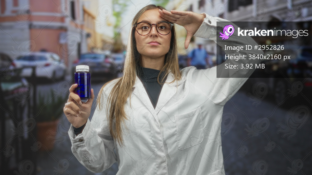 Woman in white lab coat and glasses holding cobalt blue bottle, hand to forehead on a cobblestone street lined with parked cars and old buildings; confidence curiosity. - Kraken Images