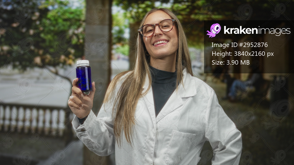 Woman in white lab coat holding a blue bottle and smiling on a street colonnade while wearing glasses; health confidence.