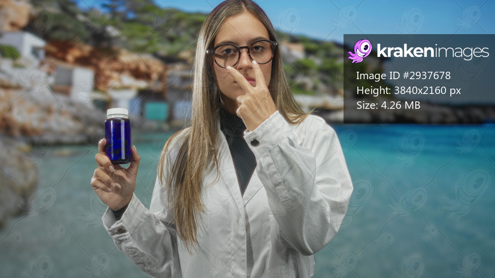 Woman in white lab coat holding blue bottle points finger toward camera in studio; safety advice confidence.