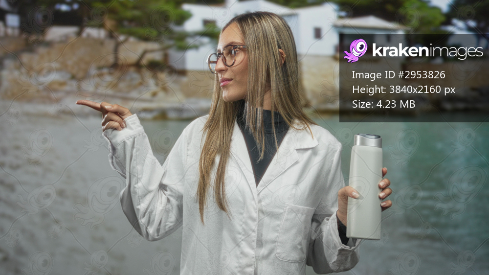 Woman in white lab coat holding bottle and pointing finger by the sea near a building on rocky shore; product demo confidence.