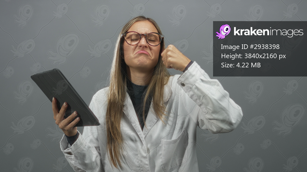 Woman in white lab coat holding tablet and making a scrunched face with closed fist near cheek in studio; disgust.