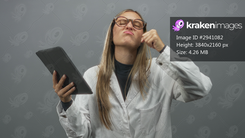 Woman in white lab coat holding tablet and making a scrunched face with closed fist near cheek in studio; disgust.