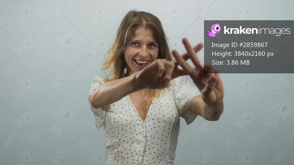 Woman in white polka dot dress crossing index fingers to form a hashtag sign in studio against pale gray backdrop; playful joy.