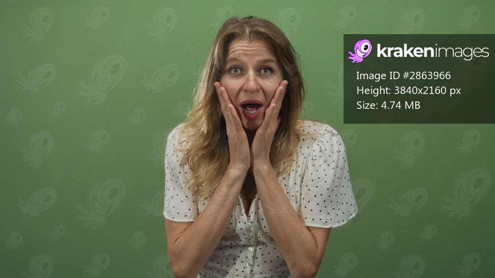 Woman in white polka dot dress holding hands to cheeks and covering mouth with surprised expression in green studio; surprise curiosity.